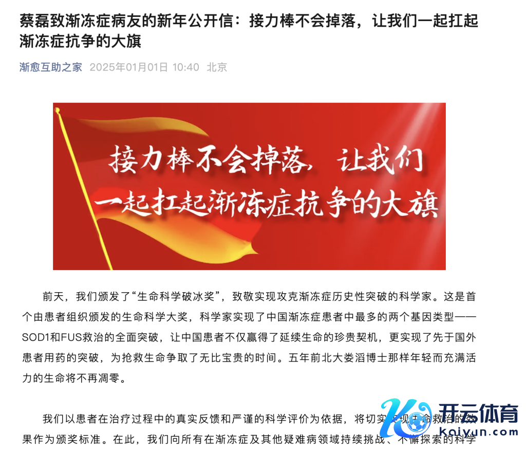本年1月1日,蔡磊发布了一封新年公开信。他在信中写谈:“未到绝境处,此岸花不开。”面对渐冻症的阴毒侵袭,蔡磊从未毁灭过但愿,他以我方的时势,赓续与病魔起义,同期推动着渐冻症科研的前进。